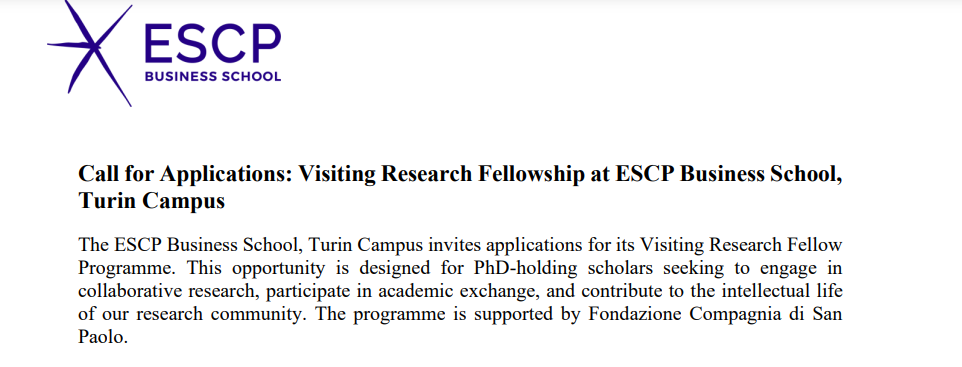 The ESCP Business School, Turin Campus invites applications for its Visiting Research Fellow Programme. This opportunity is designed for PhD-holding scholars seeking to engage in collaborative research, participate in academic exchange, and contribute to the intellectual life of our research community. The programme is supported by Fondazione Compagnia di San Paolo.